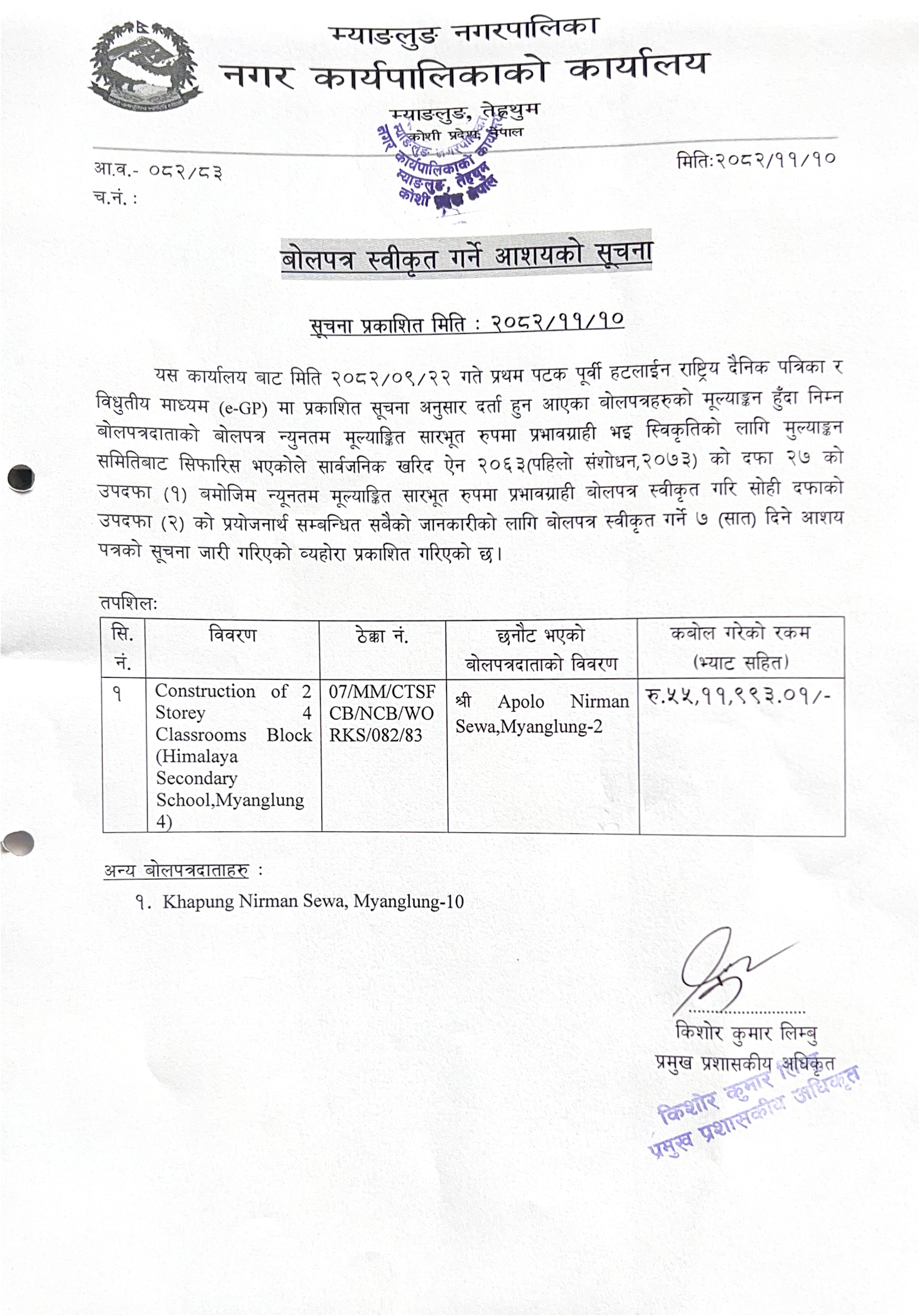 बोलपत्र स्वीकृत गर्ने आशयको सूचना (प्रकाशित मिति : २०८२/११/१० गते )