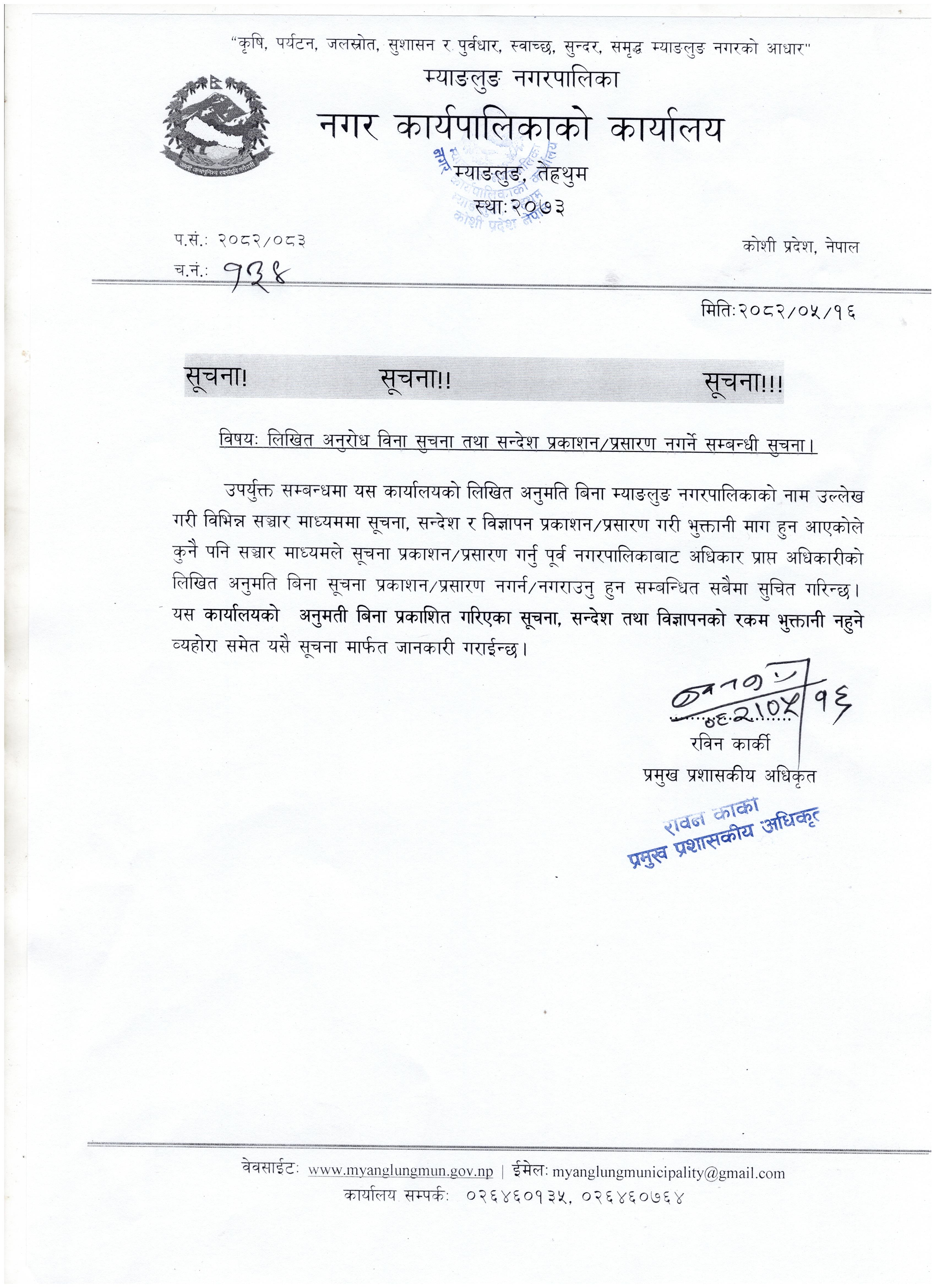 लिखित अनुरोध विना सुचना तथा सन्देश प्रकाशन/प्रसारण नगर्ने सम्बन्धी सुचना ।