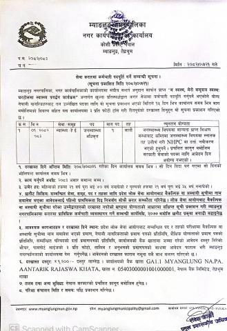 म्याङलुङ्ग नगरपालिकाका स्थानीय खोला तथा खानी बाट ढुंगा, गिट्टी, बालुवा लगायतका निर्माण सामाग्री उत्खनन तथा संकलन कार्यका बिक्री कर असुलीको ठेक्का बन्दोबस्ती सम्बन्धी बोलपत्र आह्वानको सूचना ( दोस्रो पटक प्रकाशित मिति : २०८२/०६/०८ गते )