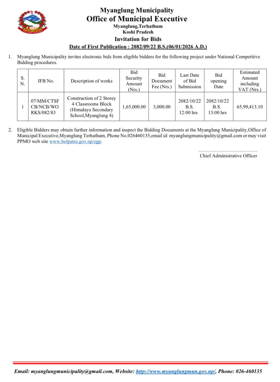 Inivitation for Bids (Construction of 2 Storey 4 Classrooms Block (Himalaya Secondary School,Myanglung 4) , IFB No : 07/MM/CTSFCB/NCB/WORKS/082/83 , Date of First Publication : 2082/09/22 B.S.)