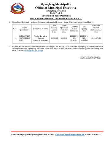 Home » Invitation for Sealed Quotation (Wadaa Karyalaya Bhawan Nirman,Myanglung 8, SQ No : 06/MM/WKBN/SQ/WORKS/082/83, Date of Second Publication : 2082/09/30 B.S.)