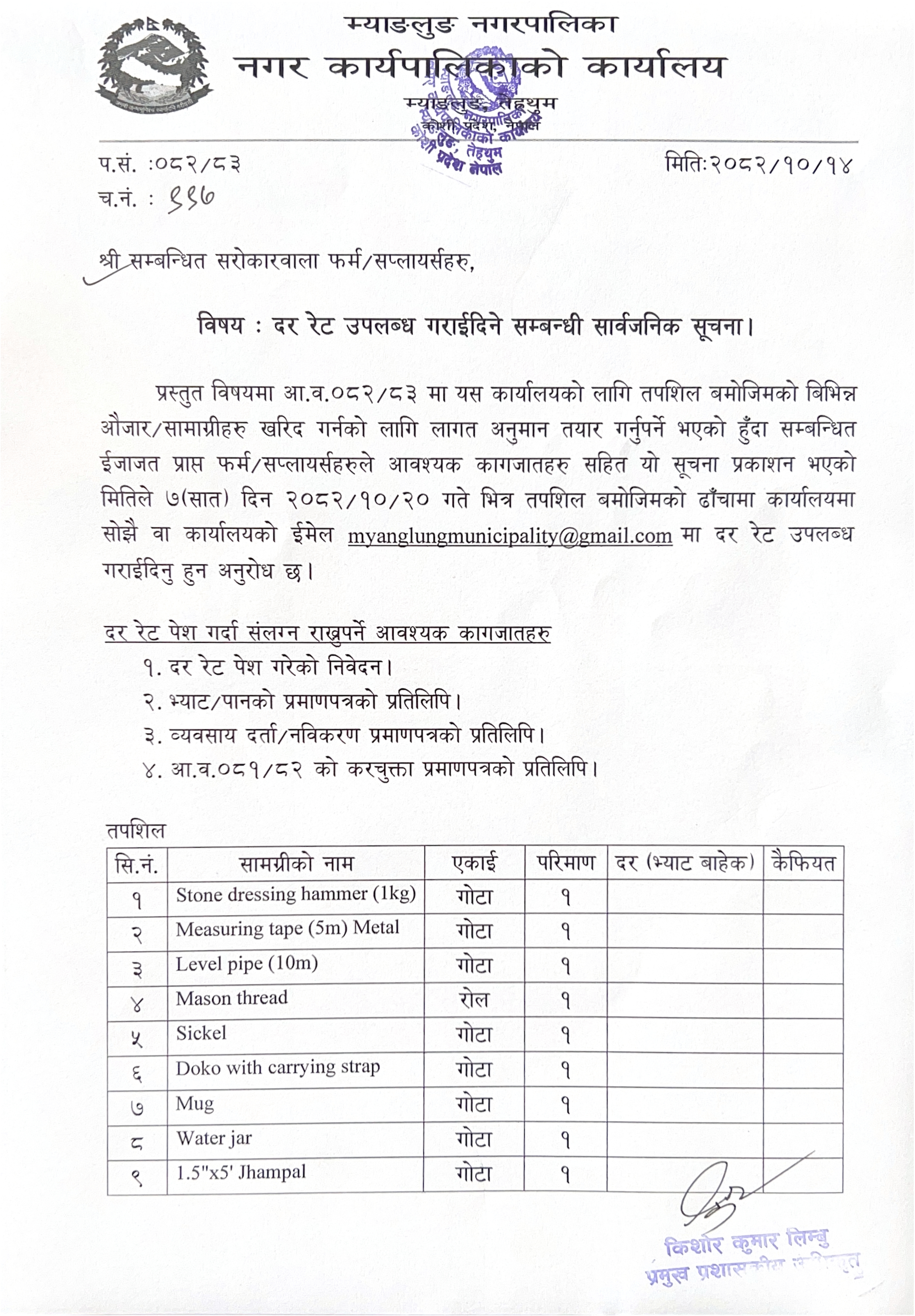 दर रेट उपलब्ध गराई दिने सम्बन्धी सार्वजनिक सूचना ( प्रकाशित मिति : २०८२/१०/१४ गते )