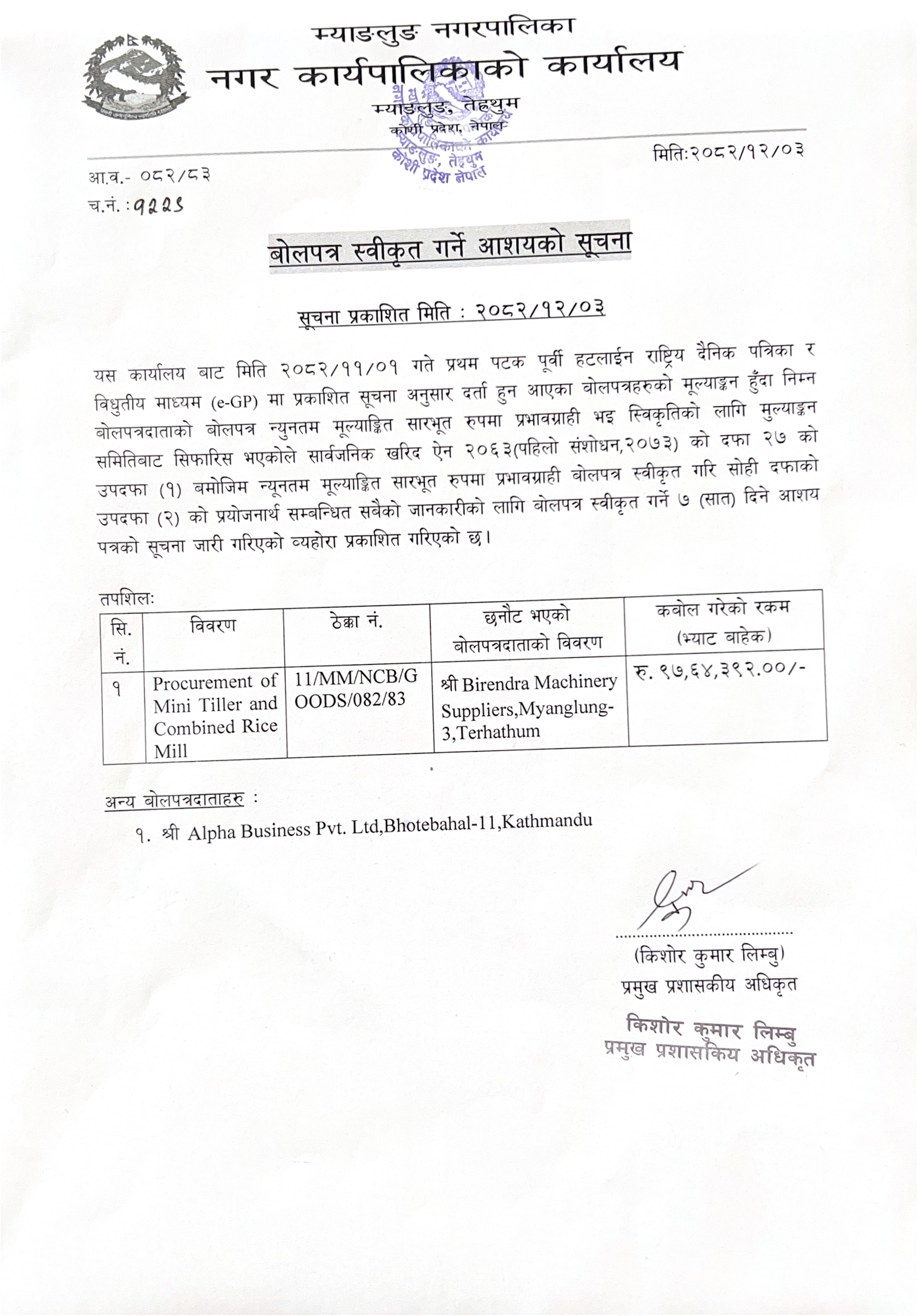बोलपत्र स्वीकृत गर्ने आशयको सूचना ( सूचना प्रकाशित मिति : २०८२/१२/०३ , Procurement of Mini Tiller and Combined Rice Mill )