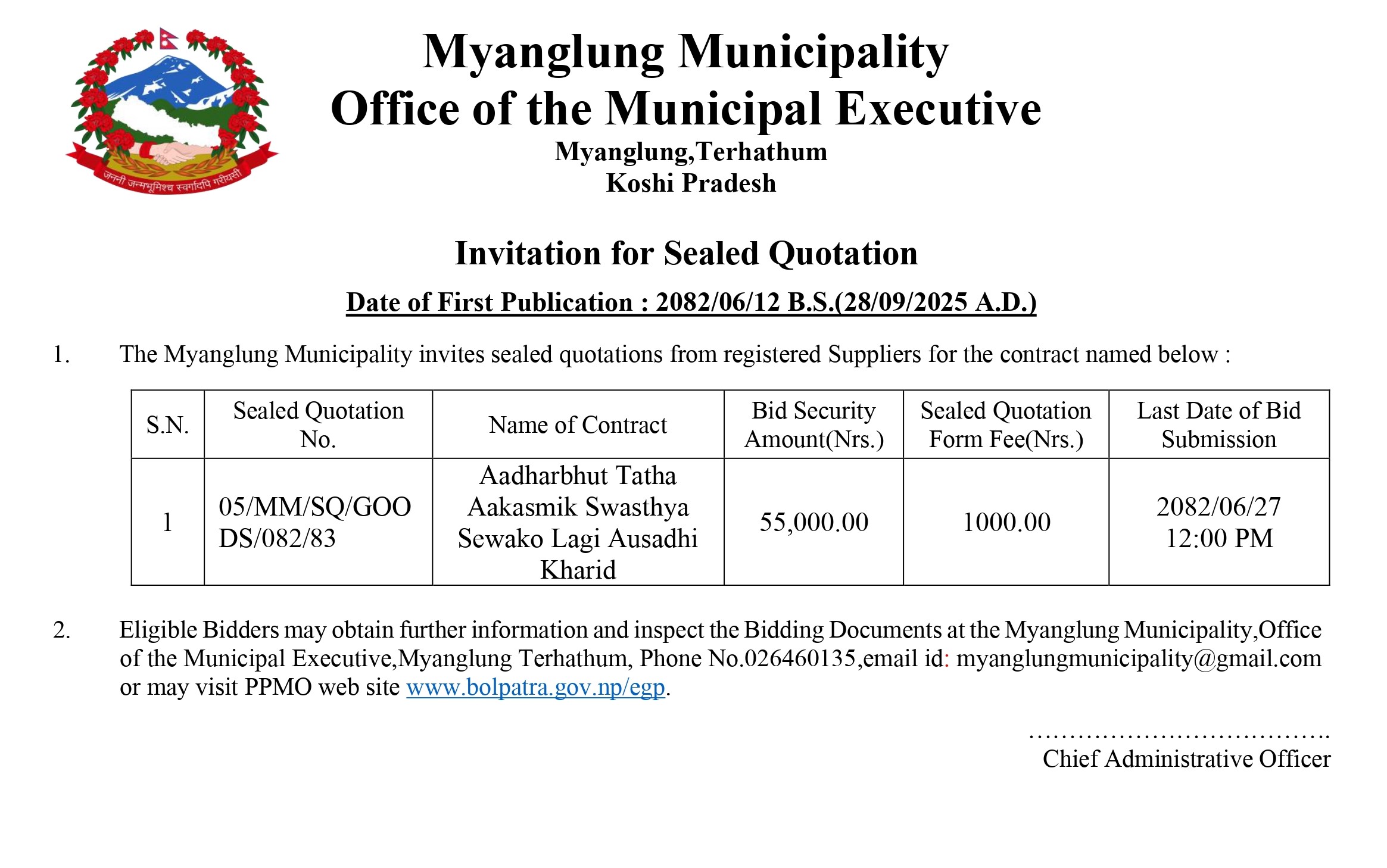 म्याङलुङ्ग नगरपालिकाका स्थानीय खोला तथा खानी बाट ढुंगा, गिट्टी, बालुवा लगायतका निर्माण सामाग्री उत्खनन तथा संकलन कार्यका बिक्री कर असुलीको ठेक्का बन्दोबस्ती सम्बन्धी बोलपत्र आह्वानको सूचना ( दोस्रो पटक प्रकाशित मिति : २०८२/०६/०८ गते )