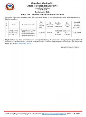 Inivitation for Bids (Construction of 2 Storey 4 Classrooms Block (Himalaya Secondary School,Myanglung 4) , IFB No : 07/MM/CTSFCB/NCB/WORKS/082/83 , Date of First Publication : 2082/09/22 B.S.)