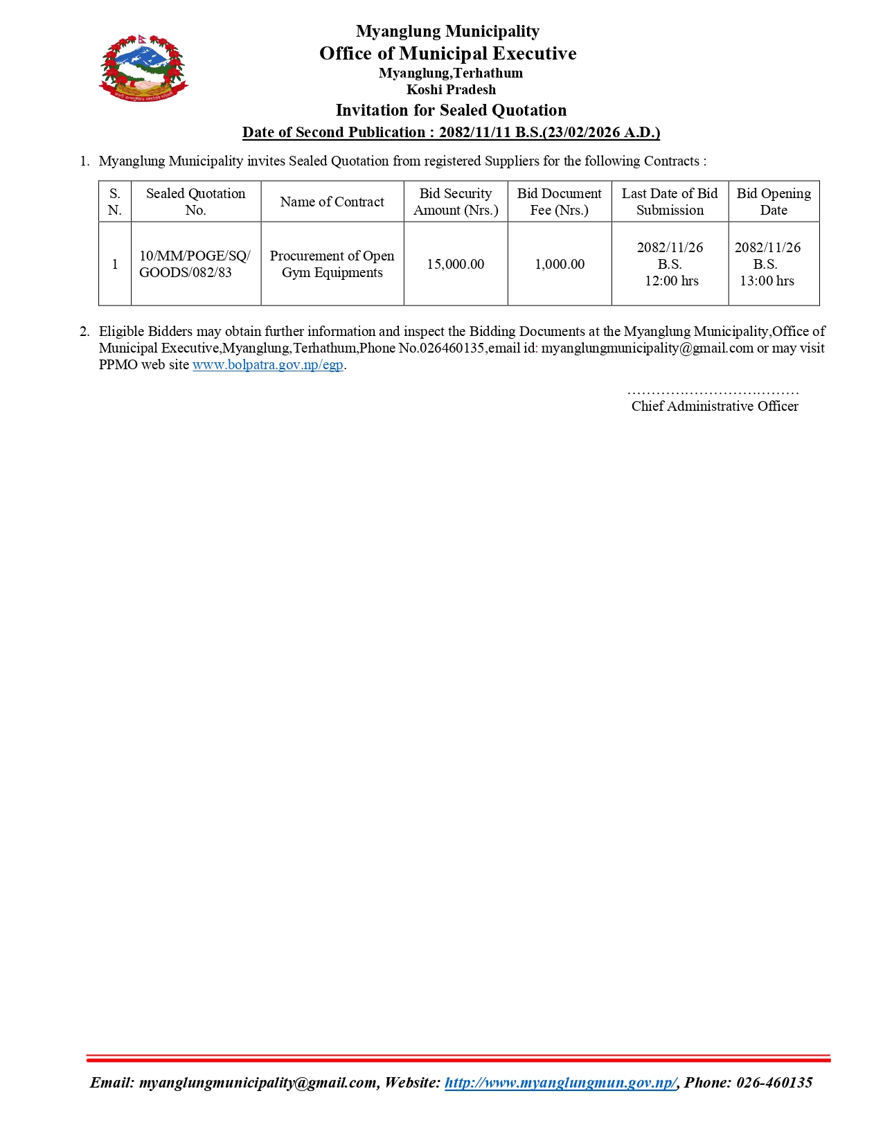 Invitation for Sealed Quotation (Procurement of Open Gym Equipments,SQ No : 10/MM/POGE/SQ/GOODS/082/83,Date of Second Publication : 2082/11/11 B.S.)